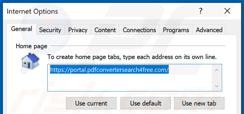 (no canto superior direito do Internet Explorer), selecione "Opções da Internet", na janela aberta remova hxxp://pdfconvertersearch4free.com e digite o domínio da sua preferência, que será aberto a cada vez inicia o Internet Explorer. Também pode inserir about: blank para abrir uma página em branco ao iniciar o Internet Explorer.