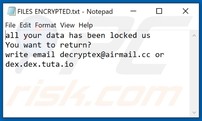 O ransomware Dex pertence à família do ransomware Dharma. Encripta os ficheiros da vítima, renomeia cada ficheiro encriptado, exibe uma janela pop-up e cria o ficheiro de texto "FILES ENCRYPTED.txt" que contém instruções sobre como entrar em contato com os desenvolvedores de ransomware. Dex renomeia ficheiros ao adicionar o ID da vítima, o endereço de e-mail decryptex@airmail.cc e ao anexar a extensão ".dex" aos nomes dos ficheiros. Por exemplo, renomeia um ficheiro denominado "1.jpg" para "1.jpg.id-C279F237.[decryptex@airmail.cc].dex", "2.jpg" to "2.jpg.id-C279F237.[decryptex@airmail.cc].dex", etc.