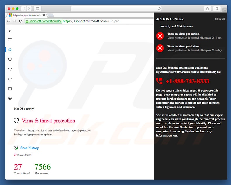 Este erro imita uma verificação do sistema e afirma que o sistema está infectado. O malware deve ser eliminado imediatamente. Portanto, os utilizadores são encorajados a entrar em contato com "técnicos certificados" através de um número de telefone ("+1-888-743-8333") fornecido, após o qual são supostamente orientados pelo processo de remoção de malware. Isso é uma farsa - seu computador provavelmente está seguro e otimizado. Os criminosos cibernéticos geram rendimento ao enganar utilizadores ingênuos para que liguem e paguem por 'suporte técnico' desnecessário. Portanto, ignore o erro "Segurança do MacOS" e deixe o site exibindo-o imediatamente. Alguns sites fraudulentos empregam scripts que evitam que os utilizadores fechem as separadores/janelas de navegação. Nestes casos, feche o navegador a usar o Gestor de Tarefas ou simplesmente reinicie o sistema. Depois de executar novamente o sistema, não restaure a sessão anterior, caso contrário arisca-se a reabrir o site fraudulento.