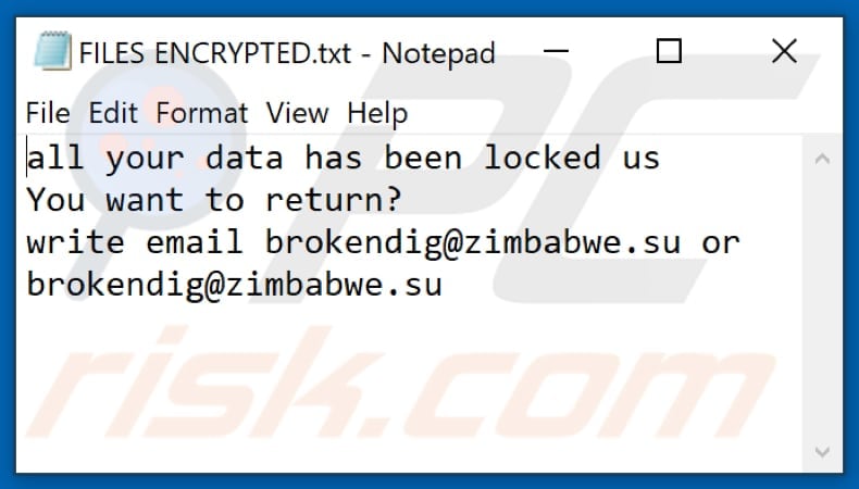 Isso, contudo, é raro. Na maioria dos casos, as infecções de ransomware exibem mensagens mais diretas, simplesmente afirmando que os dados foram encriptados e que as vítimas devem pagar algum tipo de resgate. Note que as infecções do tipo ransomware normalmente geram mensagens com nomes de ficheiro diferentes (por exemplo, "_readme.txt", "READ-ME.txt", "DECRYPTION_INSTRUCTIONS.txt", "DECRYPT_FILES.html", etc.). Portanto, usar o nome de uma mensagem de resgate pode parecer uma boa forma de identificar a infecção. O problema é que a maioria destes nomes são genéricos e algumas infecções usam os mesmos nomes, embora as mensagens exibidos sejam diferentes e as infecções em si não estejam relacionadas. Portanto, usar o nome do ficheiro da mensagem sozinho pode ser ineficaz e até mesmo conduzir à a perda de dados permanente (por exemplo, ao tentar desencriptar os dados utilizando ferramentas concebidas para diferentes infecções de resgate, é provável que os utilizadores acabem por danificar permanentemente os ficheiros e a desencriptação deixará de ser possível mesmo com a ferramenta correcta).