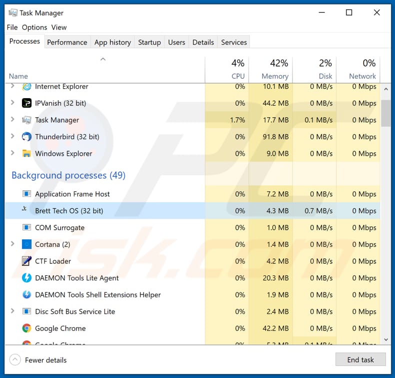 A remoção manual de malware é uma tarefa complicada - geralmente é melhor permitir que programas antivírus ou anti-malware façam isso automaticamente. Para remover este malware, recomendamos o uso de Combo Cleaner Antivirus para Windows. Se deseja remover malware manualmente, o primeiro passo é identificar o nome do malware que está a tentar remover. Aqui está um exemplo de um programa suspeito em execução no computador de um utilizador: