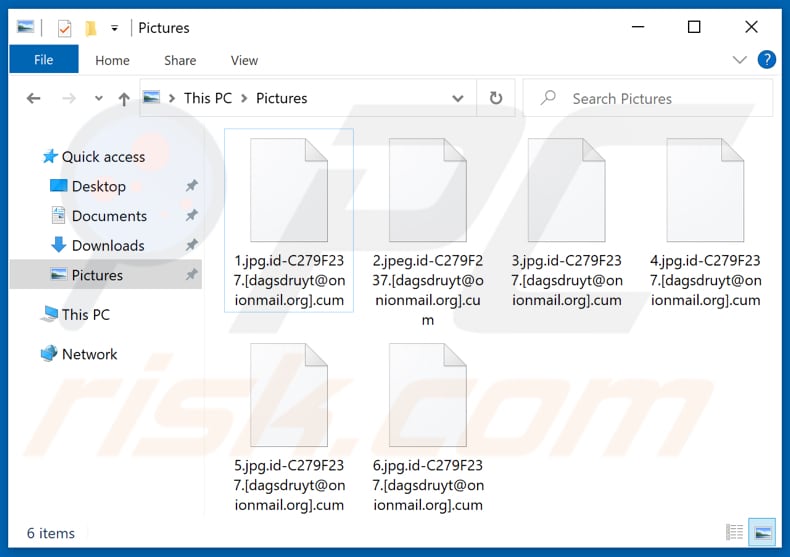 Ransomware é uma forma de malware que bloqueia o acesso aos ficheiros ao encriptá-los e gera (cria ou exibe, ou ambos) uma nota de resgate para fornecer contato, pagamento e outras informações. Cum faz parte da família do ransomware Dharma. Esta variante encripta e renomeia ficheiros - anexa o ID da vítima, o endereço de e-mail dagsdruyt@onionmail.org e a extensão ".cum" aos seus nomes de ficheiro. Por exemplo, renomeia um ficheiro denominado "1.jpg" para "1.jpg.id-C279F237.[dagsdruyt@onionmail.org].cum", "2.jpg" para "2.jpg.id-C279F237.[dagsdruyt@onionmail.org].cum", e assim por diante. Cum exibe uma janela pop-up e cria o ficheiro de texto "info.txt" como as suas notas de resgate.