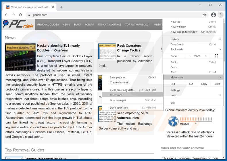 (no canto superior direito do Google Chrome), selecione "Mais ferramentas" e clique em "Extensões". Localize todos os complementos de navegador suspeitos instalados recentemente e remova-os.