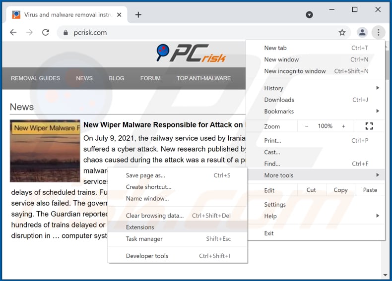 (no canto superior direito do Google Chrome), seleccione "Mais ferramentas" e clique em "Extensões". Localize todos os complementos de navegador suspeitos recentemente instalados e remova-os.