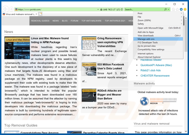 (no canto superior direito do Internet Explorer), selecione "Gerir Complementos". Procure extensões de navegador suspeitas instaladas recentemente, selecione essas entradas e clique em "Remover".