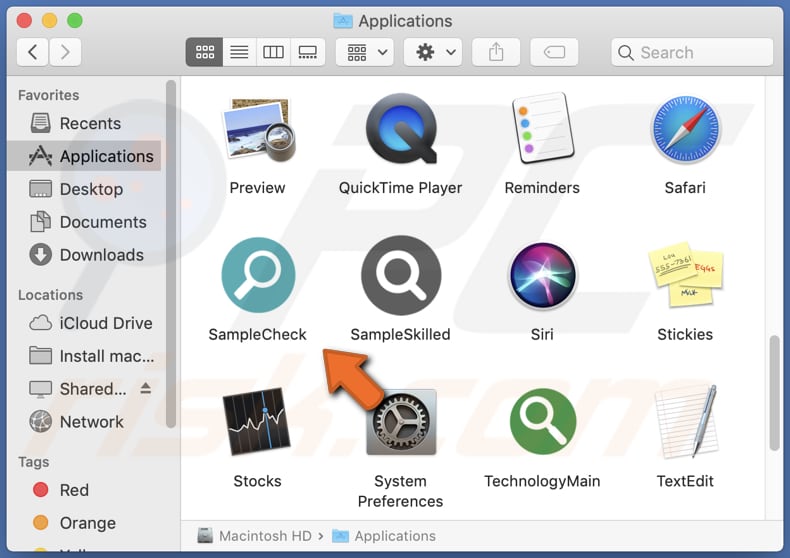 Remova as aplicações potencialmente indesejadas relacionadas a SampleCheck da sua pasta "Aplicações":