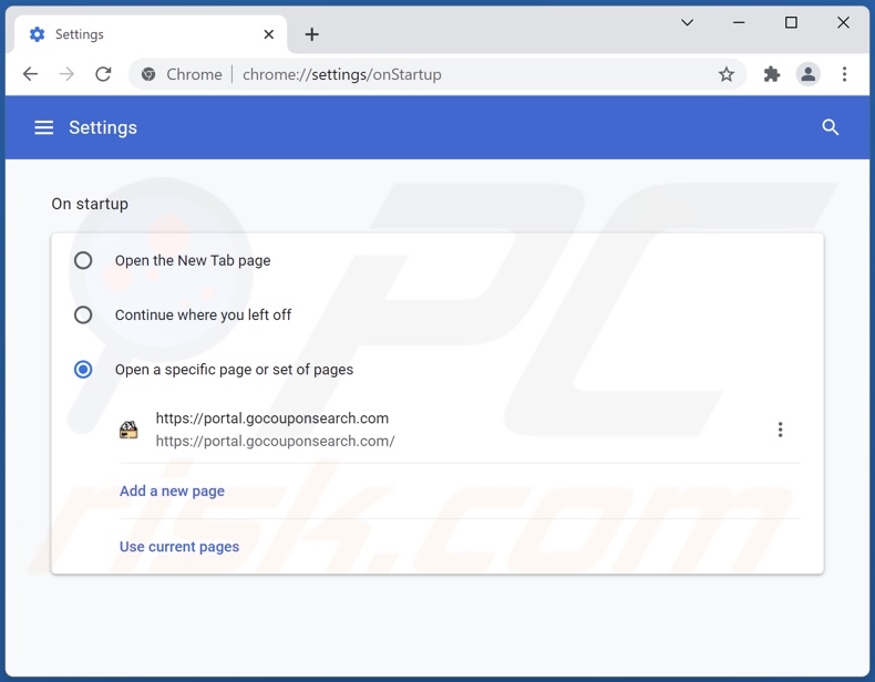 (no canto superior direito do Google Chrome), seleccione "Configurações". Na secção "Iniciar", desative "GoCouponSearch", procure pelo URL do sequestrador de navegador (hxxp://www.gocouponsearch.com) abaixo da opção “Abrir uma página específica ou um conjunto de páginas”. Se presente, clique no ícone dos três pontos verticais e seleccione "Remover".