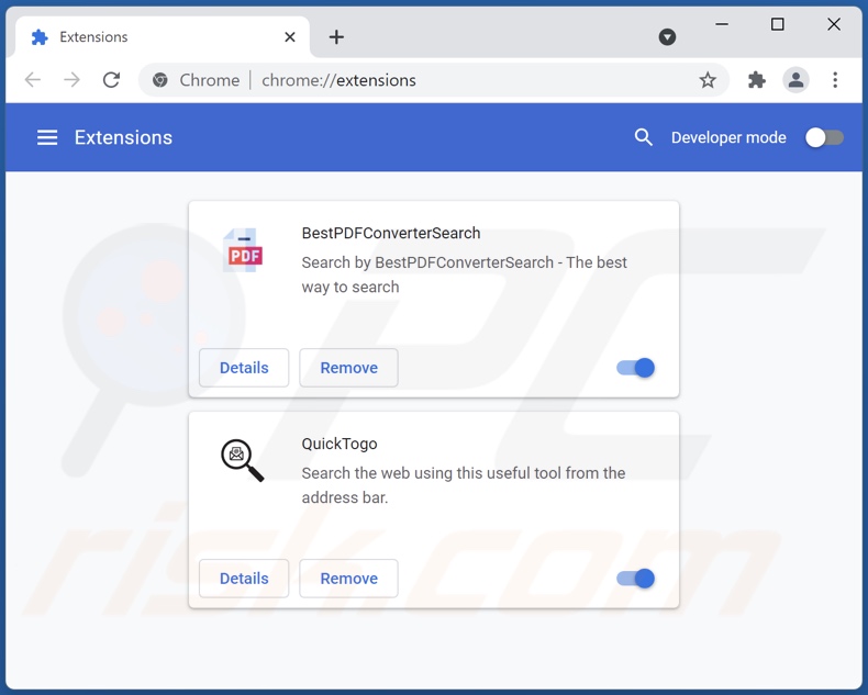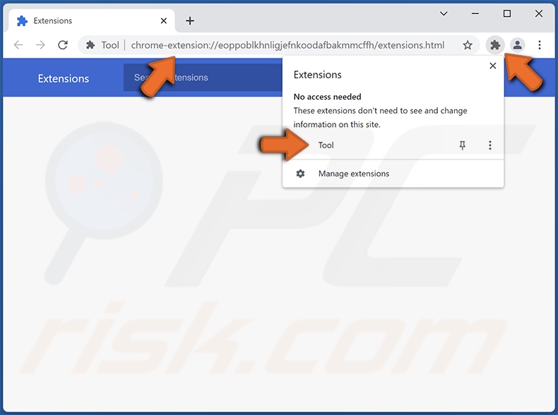 Além disso, este software tende a usar certas técnicas para impedir que os utilizadores recuperem os seus navegadores. O sequestrador de navegador "Tool" nega o acesso à lista de extensões do Google Chrome ("chrome://extensions/") e exibe uma falsa ("chrome-extension://[user's_ID]/extensions.html). A extensão do navegador também usa o recurso "Managed by your organization" do Chrome.