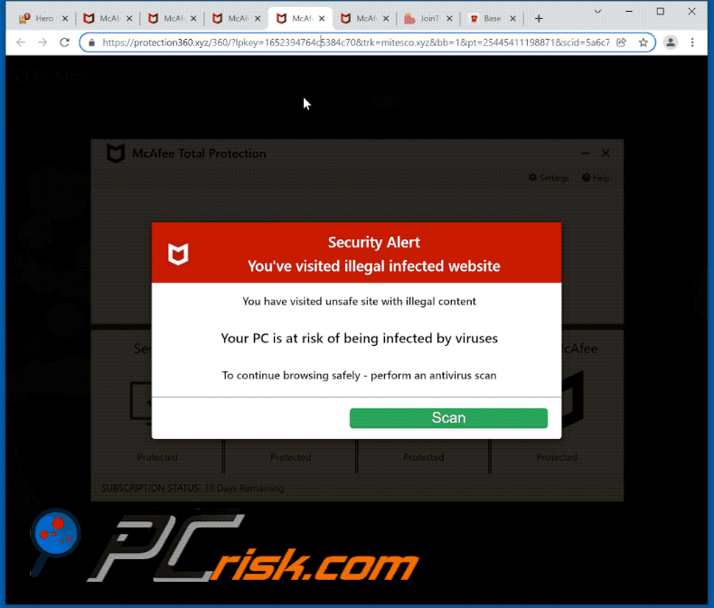 "You've visited illegal infected website" é uma fraude disfarçado como um alerta de segurança da McAfee. Deve-se enfatizar que este alerta falso não está de forma alguma associado ao antivírus McAfee ou McAfee Corp.