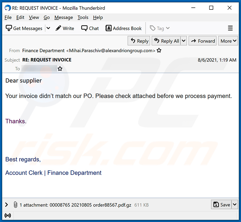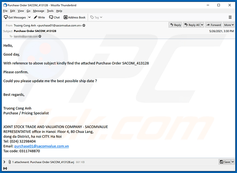 Esta campanha de email distribui um ficheiro (.ace) de ficheiros apresentando-o como um ficheiro detalhando as informações de compra. Na verdade, os ficheiros compactados são maliciosos - executá-los resulta na infiltração do trojan Pony. Felizmente, este malware tem como alvo apenas o sistema operativo Microsoft Windows e os utilizadores de outras plataformas (por exemplo, Linux, MacOS e assim por diante) estão seguros.