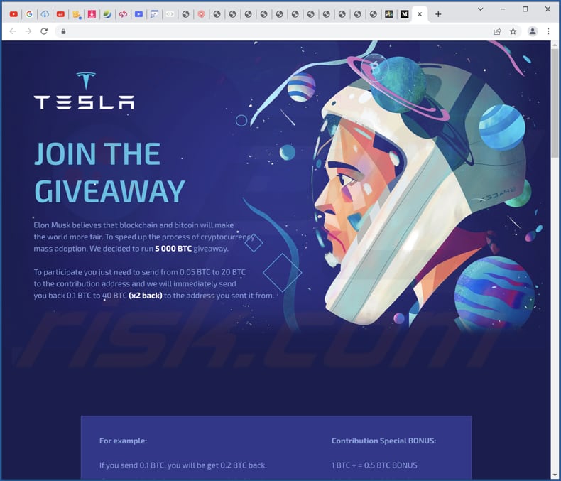 Exemplos de fraudes semelhantes são "BTC Giveaway Scam", "Ethereum Giveaway Scam", "Doge Giveaway Scam" (dois partilham um design de site praticamente idêntico). A maioria dos criminosos cibernéticos por trás de brindes falsos de criptomoedas afirma que é possível participar apenas uma vez para induzir as pessoas a enviar mais criptomoedas.