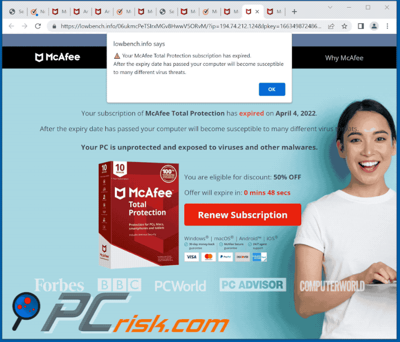 Ao inspecionar sites que usam redes de publicidade fraudulentas, a nossa equipa de pesquisa encontrou uma página Web que promovia a fraude "McAfee Total Protection has expired" scam. Encontramos duas variantes desta fraude, que alegam que a assinatura do antivírus McAfee do visitante expirou e pedem que a renovem.