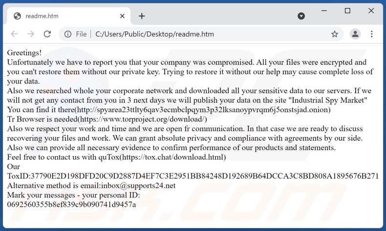 Screenshot do ficheiro HTML do ransomware Industrial Spy Market ("readme.html"):