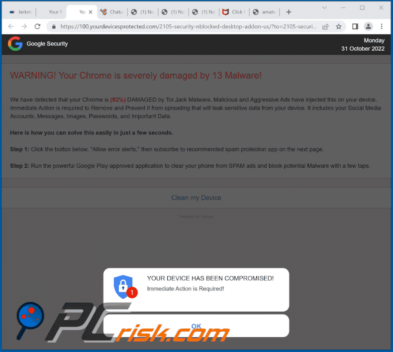 Yourdevicesprotected[.]com exibe uma mensagem pop-up afirmando que um dispositivo foi comprometido e incitando os visitantes a tomarem medidas imediatas. Esta página também declara que o navegador Chrome está danificado por malware. O Yourdevicesprotected[.]com instrui os visitantes a clicar no botão "Permitir alertas de erro" e executar alguma aplicação aprovada pelo Google Play para proteger um dispositivo contra spam.