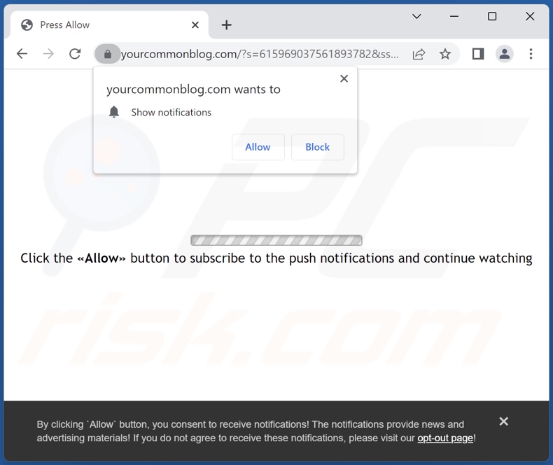 Quando verificámos o yourcommonblog[.]com, este apresentou-nos uma página branca contendo texto e uma barra de carregamento. Esta página instruiu-nos ilusoriamente para - "Clique no botão Permitir para subscrever as notificações push e continuar a observar" - implicando assim que a distribuição da notificação deve ser activada para continuar a visualizar o conteúdo online.