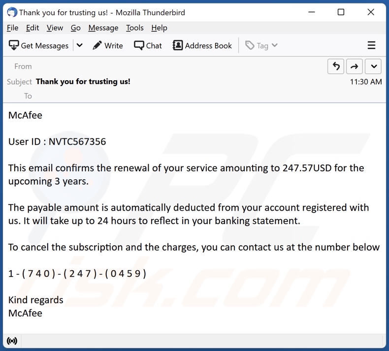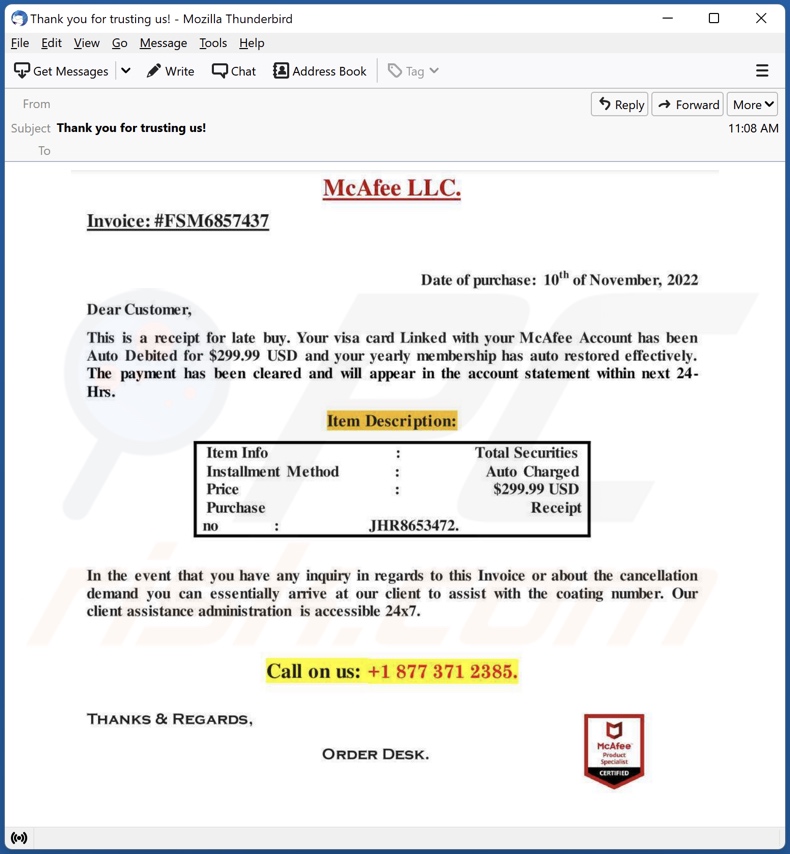 Deve salientar-se que estes emails são falsos, e não estão associados com o actual McAfee Corp. Este email de spam tem como objectivo enganar os destinatários para que estes telefonem para os números de telefone fornecidos - puxando-os assim para uma fraude de chamada de retorno.