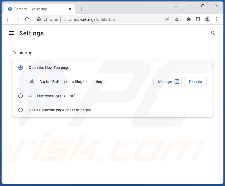 (o canto superior direito do Google Chrome), selecione "Configurações". Na seção "Na inicialização", desative "Capital Buff", procure um URL de sequestrador de navegador (hxxp://www.capital-buff.com) abaixo de "Abrir um opção específica ou conjunto de páginas”. Se estiver presente, clique no ícone de três pontos verticais e selecione "Remover".
