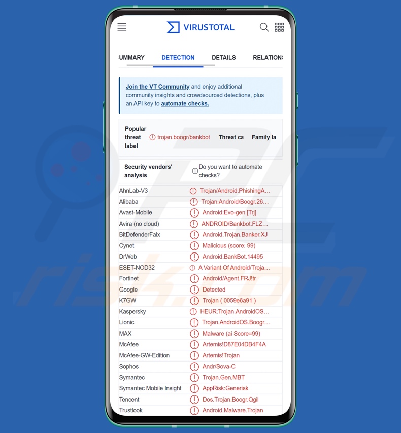 | Nomes de Detecção | Avast-Mobile (Android:Evo-gen [Trj]), DrWeb (Android.BankBot.14495), ESET-NOD32 (Uma Variante De Android/TrojanDropper.Agen), Fortinet (Android/Agent.FRJ!tr), Kaspersky (HEUR:Trojan.AndroidOS.Boogr.gsh), Lista Completa (VirusTotal) |