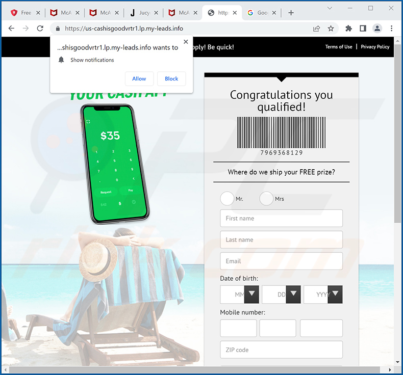 Esta página de fraude é disfarçada de Cash App Money Generator, que gera somas específicas de dinheiro para os utilizadores sem custos. Note-se que o serviço de pagamento móvel Cash App genuíno não tem nada a ver com esta fraude de phishing. O principal objectivo dos vigaristas por trás desta página web é enganar os visitantes para que estes forneçam informações sensíveis e pessoais.