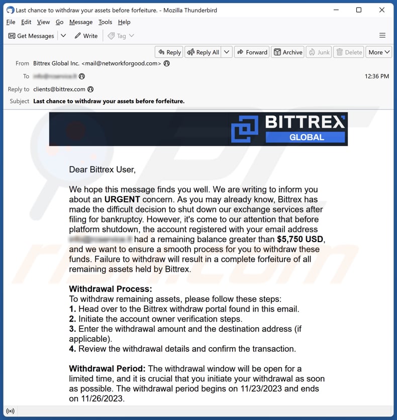 O email da fraude começa com uma saudação educada, alegando que se dirige ao destinatário sobre um assunto urgente. Afirma que o Bittrex, uma bolsa de criptomoedas, está a encerrar os seus serviços após ter declarado falência. Os vigaristas alegam que a conta do destinatário, ligada ao endereço de email fornecido, tem um saldo remanescente superior a $5,750.