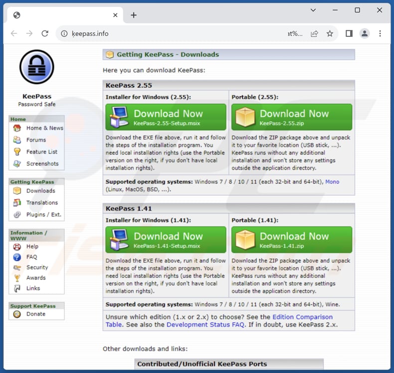 Clicar na hiperligação incorrecta leva os utilizadores a um site falso do KeePass que utiliza o Punycode no URL. Este truque foi utilizado para fazer com que o site se pareça com o verdadeiro. Se os utilizadores clicarem nas hiperligações de descarregamento do site falso, o software nocivo é colocado nos seus computadores.