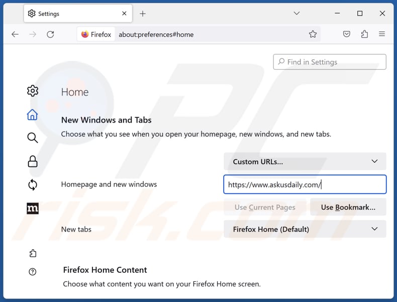 - PASSO 3. Remova a página inicial do askusdaily.com e o mecanismo de pesquisa padrão do Mozilla Firefox.