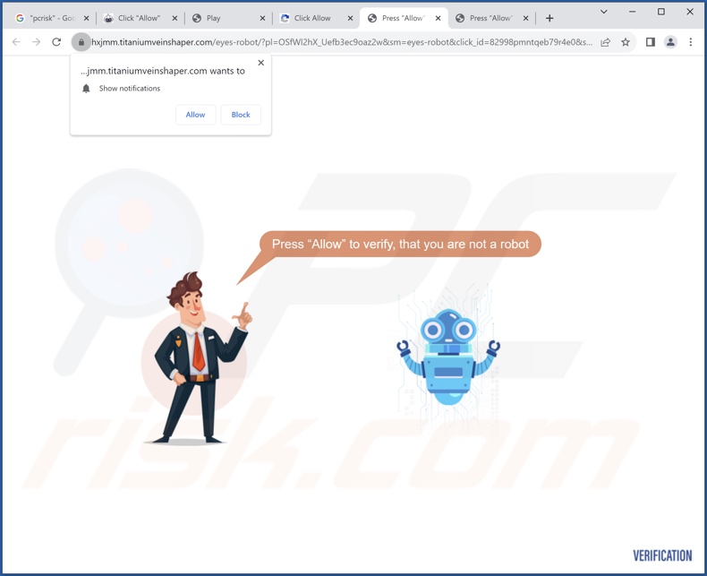 Como mencionado na introdução, o titaniumveinshaper[.]com tem como objetivo enganar os utilizadores para que permitam notificações do navegador. Encontrámos duas variantes de aparência deste site que utilizam testes CAPTCHA falsos para este propósito, ou seja, "PRESS THE 'ALLOW' BUTTON TO VERIFY THAT YOU'RE HUMAN!" e "Press 'Allow' to verify, that you are not a robot".