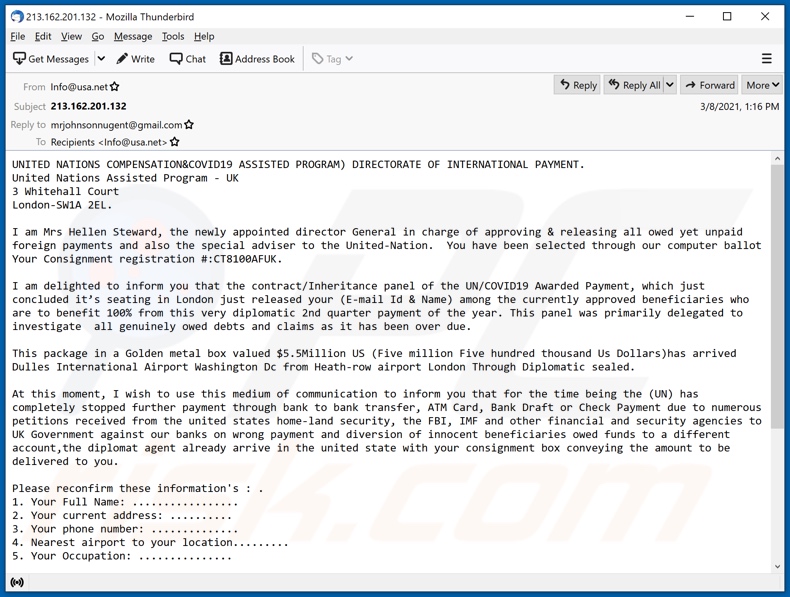 Phishing/FraudeTambém conhecido como: UNITED NATIONS COMPENSATION (COVID19 ASSISTED PROGRAM) spam