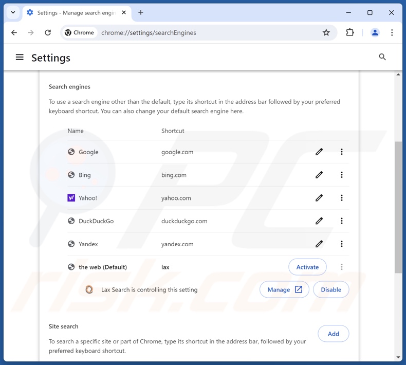 O Lax Search faz alterações nas seguintes definições do navegador - páginas iniciais, motores de busca padrão, e novos separadores/janelas. Com esta extensão instalada, as pesquisas na Web realizadas através da barra de URL resultam em redireccionamentos para laxsearch.com.