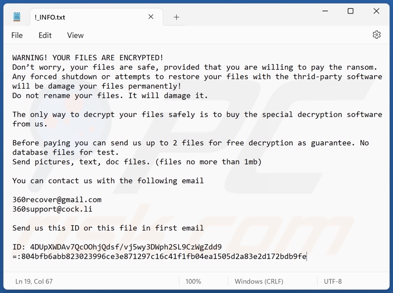 Isso, contudo, é raro. Na maioria dos casos, as infecções de ransomware exibem mensagens mais diretas, simplesmente afirmando que os dados foram encriptados e que as vítimas devem pagar algum tipo de resgate. Note que as infecções do tipo ransomware normalmente geram mensagens com nomes de ficheiro diferentes (por exemplo, "_readme.txt", "READ-ME.txt", "DECRYPTION_INSTRUCTIONS.txt", "DECRYPT_FILES.html", etc.). Portanto, usar o nome de uma mensagem de resgate pode parecer uma boa forma de identificar a infecção. O problema é que a maioria destes nomes são genéricos e algumas infecções usam os mesmos nomes, embora as mensagens exibidos sejam diferentes e as infecções em si não estejam relacionadas. Portanto, usar o nome do ficheiro da mensagem sozinho pode ser ineficaz e até mesmo conduzir à a perda de dados permanente (por exemplo, ao tentar desencriptar os dados utilizando ferramentas concebidas para diferentes infecções de resgate, é provável que os utilizadores acabem por danificar permanentemente os ficheiros e a desencriptação deixará de ser possível mesmo com a ferramenta correcta).