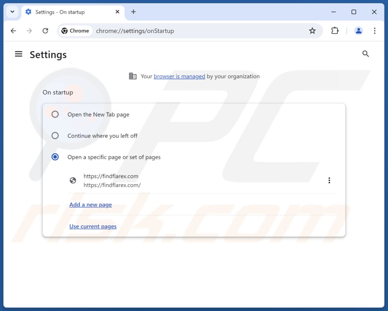 (no canto superior direito do Google Chrome), seleccione "Definições". Na secção "No arranque", desactive "KSEARCHY", procure um URL de sequestrador de navegador (hxxp://www.findflarex.com) abaixo da opção "Abrir uma página específica ou um conjunto de páginas". Se estiver presente, clique no ícone dos três pontos verticais e seleccione "Remover".