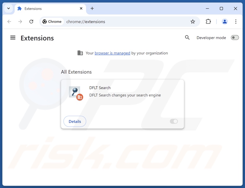O software de sequestro de navegador utiliza frequentemente mecanismos de garantia de persistência para impedir a recuperação do navegador. A DFLT Search utiliza a funcionalidade "Gerido pela sua organização" Google Chrome para este efeito.