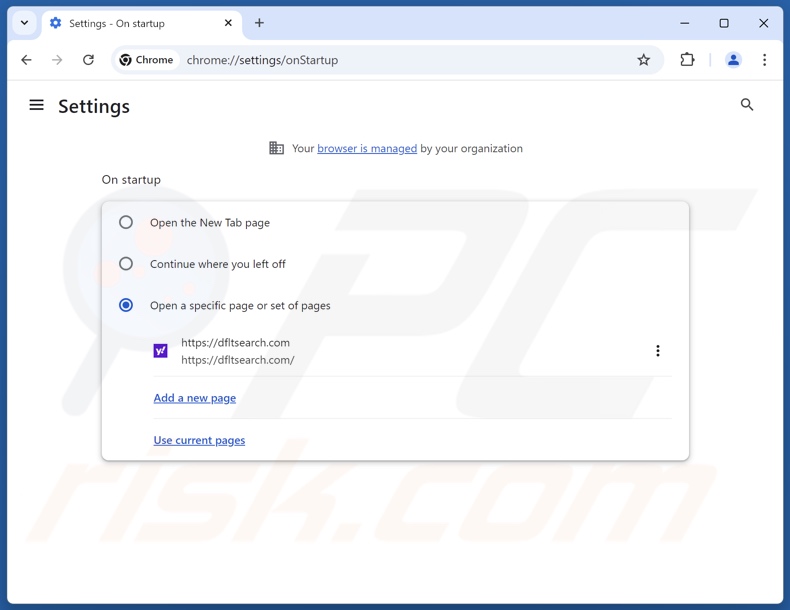 (no canto superior direito do Google Chrome), selecione "Definições". Na secção "No arranque", desactive "DFLT Search", procure um URL de sequestrador de navegador (hxxp://www.dfltsearch.com) abaixo da opção "Abrir uma página específica ou um conjunto de páginas". Se estiver presente, clique no ícone dos três pontos verticais e selecione "Remover".