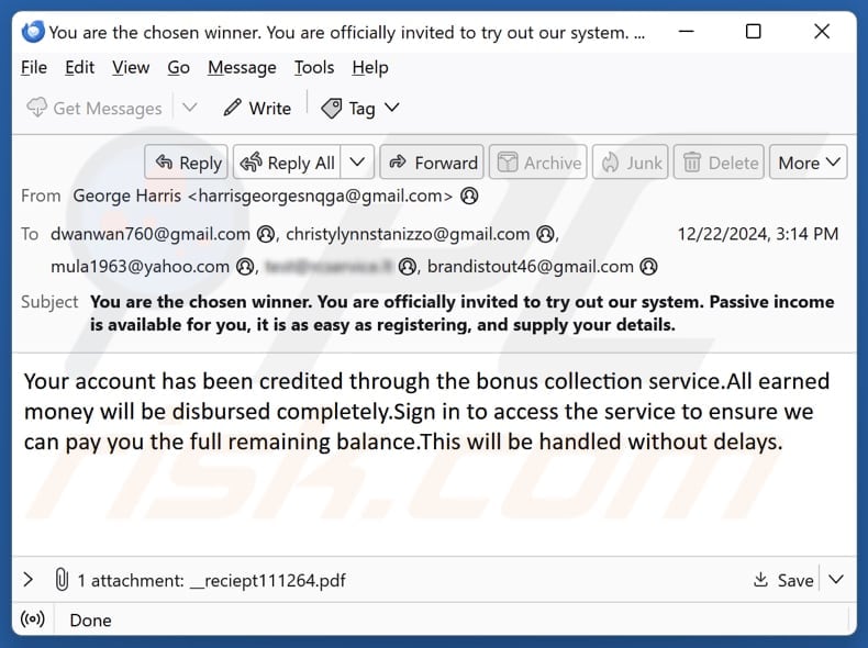 O e-mail enganador que promove este esquema afirma que a conta do destinatário foi creditada através de um "serviço de recolha de bónus" e que todo o dinheiro ganho será totalmente desembolsado. Insta o destinatário a iniciar sessão para aceder ao serviço e sublinha que, ao fazê-lo, garantirá o pagamento imediato do saldo remanescente.