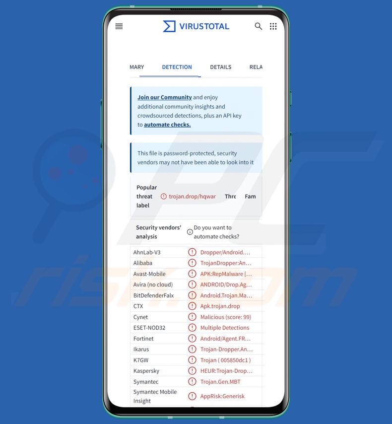 | Nomes de deteção | Avast-Mobile (APK:RepMalware [Trj]), ESET-NOD32 (Detecções múltiplas), Fortinet (Android/Agent.FRJ!tr), Ikarus (Trojan-Dropper.AndroidOS.Agent), Kaspersky (HEUR:Trojan-Dropper.AndroidOS.Hqwar.df), Lista completa (VirusTotal) |