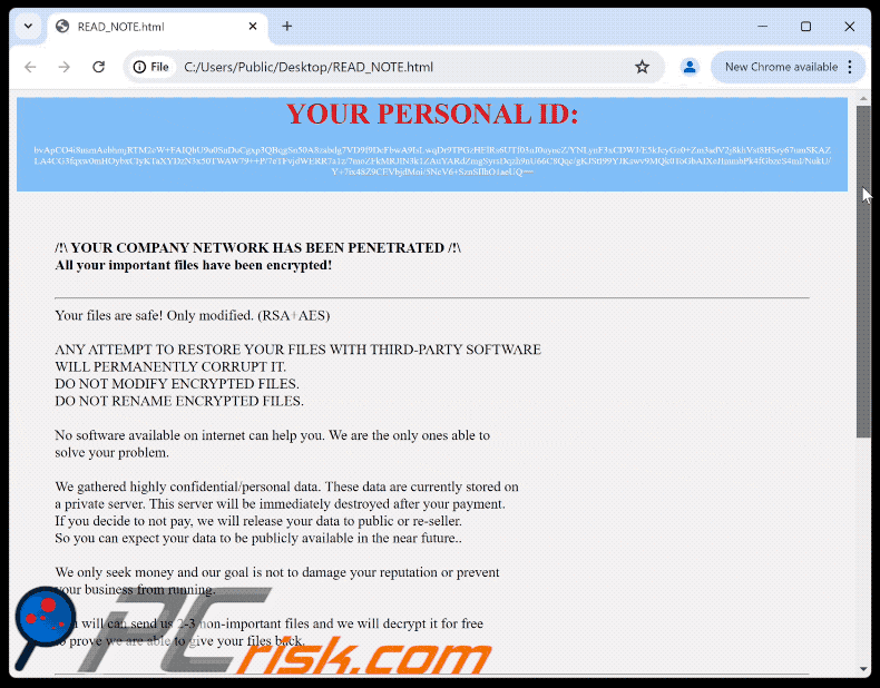 Isso, contudo, é raro. Na maioria dos casos, as infecções de ransomware exibem mensagens mais diretas, simplesmente afirmando que os dados foram encriptados e que as vítimas devem pagar algum tipo de resgate. Note que as infecções do tipo ransomware normalmente geram mensagens com nomes de ficheiro diferentes (por exemplo, "_readme.txt", "READ-ME.txt", "DECRYPTION_INSTRUCTIONS.txt", "DECRYPT_FILES.html", etc.). Portanto, usar o nome de uma mensagem de resgate pode parecer uma boa forma de identificar a infecção. O problema é que a maioria destes nomes são genéricos e algumas infecções usam os mesmos nomes, embora as mensagens exibidos sejam diferentes e as infecções em si não estejam relacionadas. Portanto, usar o nome do ficheiro da mensagem sozinho pode ser ineficaz e até mesmo conduzir à a perda de dados permanente (por exemplo, ao tentar desencriptar os dados utilizando ferramentas concebidas para diferentes infecções de resgate, é provável que os utilizadores acabem por danificar permanentemente os ficheiros e a desencriptação deixará de ser possível mesmo com a ferramenta correcta).
