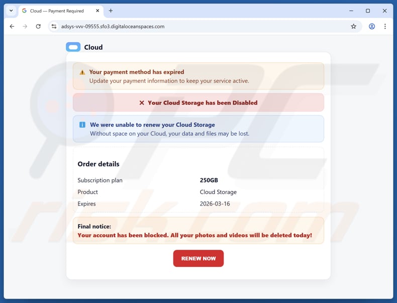Em geral, este esquema envolve alertas falsos sobre espaço de armazenamento ou assinaturas e pressiona os utilizadores a agir rapidamente. O verdadeiro objetivo é lucrar com comissões de afiliados. Mesmo quando são promovidos produtos reais, os métodos utilizados são enganosos e não são empregues por empresas legítimas. Os destinatários de e-mails fraudulentos devem ignorar essas mensagens e não aceder aos sites indicados.
