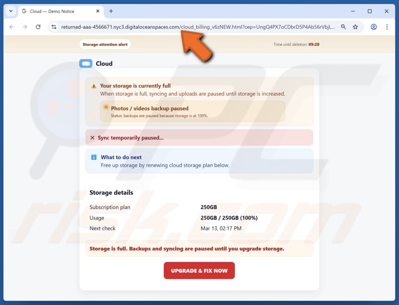 A nossa equipa analisou esta mensagem e concluiu que se trata de uma fraude disfarçada de notificação de um serviço na nuvem relativa ao armazenamento da conta. A mensagem insta os destinatários a clicarem num link incluído na mensagem. Seguir as instruções contidas no e-mail pode redirecionar os utilizadores para sites fraudulentos. Recomenda-se ignorar e eliminar este e-mail, caso o receba.