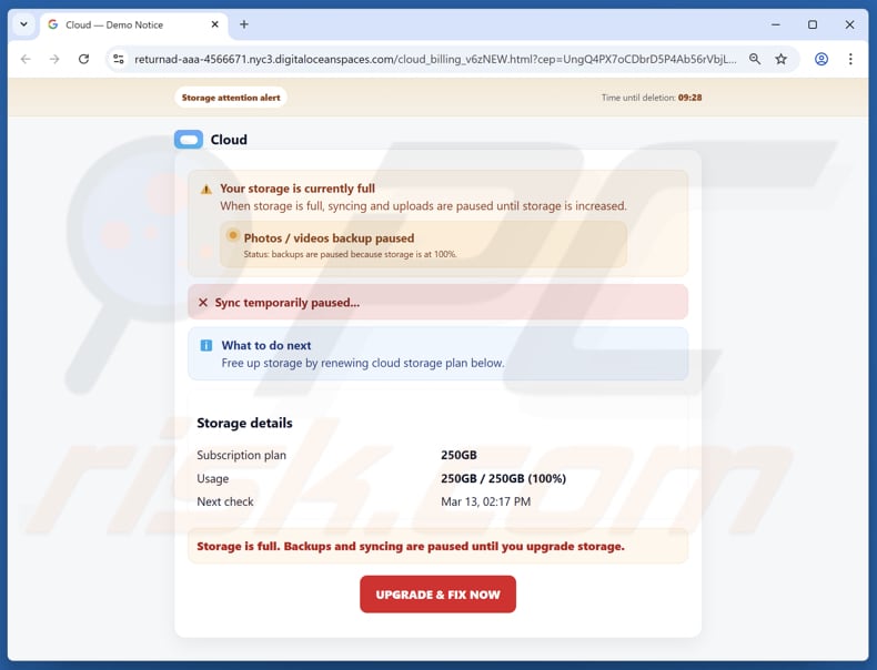 Estes sites utilizam táticas semelhantes às do e-mail promocional. Apresentam um suposto problema com uma conta de armazenamento e instam a uma ação imediata para evitar consequências negativas. Alegam que o espaço de armazenamento está cheio, que uma subscrição expirou ou que uma tentativa de pagamento não foi bem-sucedida.