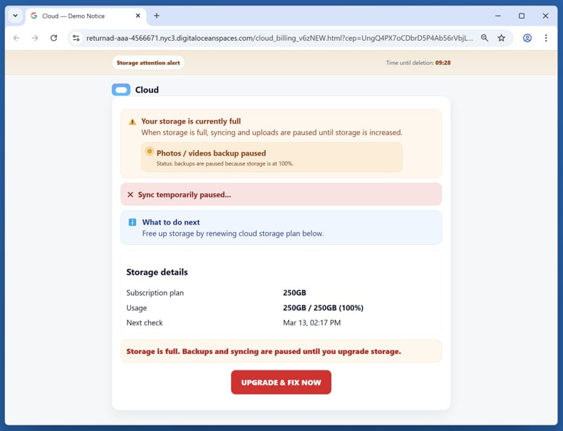 Em conclusão, trata-se de um golpe concebido para enganar os destinatários, fazendo-os pensar que a sua subscrição de armazenamento na nuvem expirou e que os ficheiros podem ser perdidos a menos que os dados de pagamento sejam atualizados. O seu objetivo é pressionar os utilizadores a clicar em ligações maliciosas que geram lucro para os burlões através de marketing de afiliados.