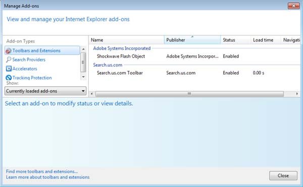 (no canto superior direito do Internet Explorer) selecione "Gerir Add-ons". Procure pelas entradas relacionadas com search.us.com (Barra de Ferramentas search.us.com) e desative-as. Para alterar a sua página inicial de search.us.com para a sua favorita: Clique no ícone "ferramenta"