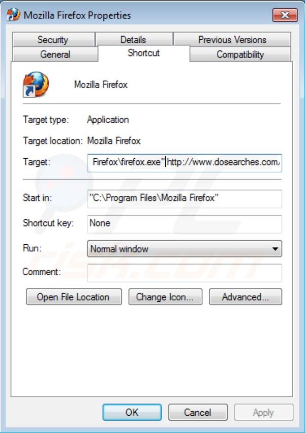 O sequestrador de navegador DoSearches.com, altera o campo "Destino" de um dos atalhos do Mozilla FireFox. Para corrigir isso - localize o seu atalho do Mozilla FireFox na área de trabalho e clique no botão direito do rato sobre ele. No menu aberto selecione "Propriedades". Na janela aberta, localize o campo de Destino e elimine todo o texto (hxxp://www.dosearches.com/...), que está inserido depois de " C:\Program Files\Mozilla Firefox\firefox.exe"
