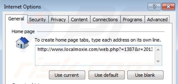 (no canto superior direito do Internet Explorer) selecione "Opções da Internet", na janela aberta remova LocalMoxie.com e escreva o domínio da sua preferência, que vai abrir cada vez que iniciar o Internet Explorer. Também pode inserir about:blank para abrir uma página em branco quando iniciar o Internet Explorer.