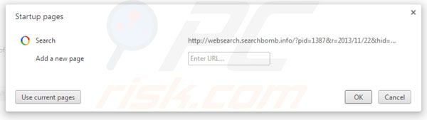 (no canto superior direito do Google Chrome) selecione "Configurações". Na seção "iniciar" clique em "definir páginas", passe o rato sobre websearch.searchbomb.info e clique no símbolo x. Agora pode adicionar o seu site favorito da sua página inicial.