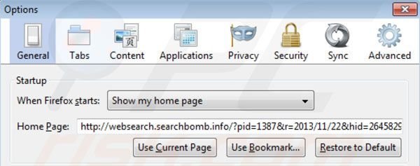 - PASSO 4. Remova Websearch.searchbomb.info da página inicial e motor de busca padrão do Mozilla Firefox.