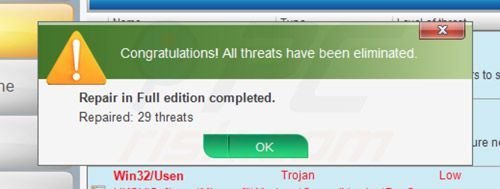 1. Aguarde até que o antivírus malicioso termine a sua verificação de segurança falsa e clique no botão "Remover Ameaças". Também pode clicar no botão "Comprar edição completa" no canto inferior direito da janela principal do programa malicioso.