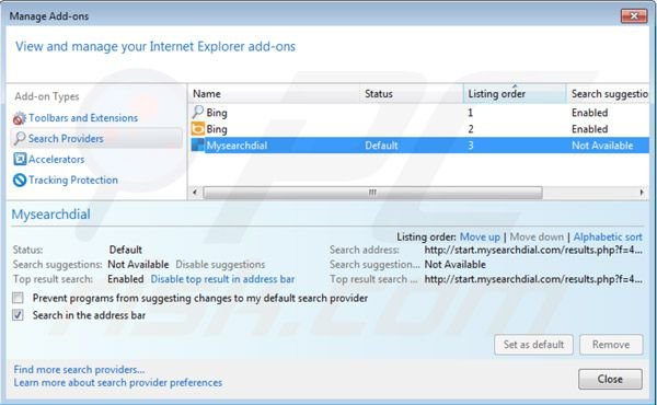 (no canto superior direito do Internet Explorer) selecione "Gerir Add-ons". Na janela aberta, selecione "Fornecedores de Pesquisa", defina "Google", "Bing" ou qualquer outro motor de pesquisa favorito como padrão e, em seguida, remova o "Mysearchdial".