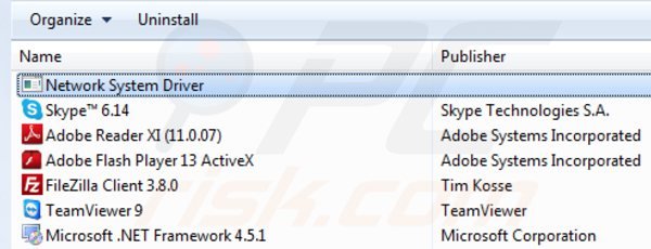 Na janela de desinstalação dos programas: procure por "Network System Driver", selecione esta entrada e clique em "Desinstalar" ou "Remover". Ignore a mensagem de aviso falso que afirma que o seu sistema se torna instável se você continuar o procedimento de desinstalação - é uma fraude. Aplicação "Unidade de Sistema de Rede" é responsável por gerar "Anúncios por OffersWizard" quando navegar na Internet.