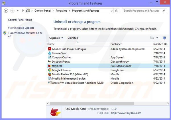 Na janela de desinstalação dos programas: procure por "foxydeal", selecione esta entrada e clique em "Desinstalar" ou "Remover".