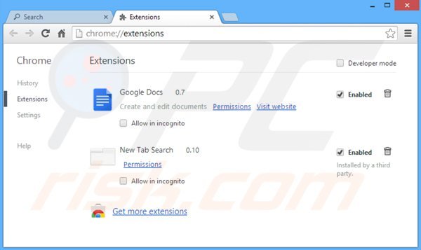(no canto superior direito do Google Chrome), selecione "Ferramentas" e clique em "Extensões". Localize add-ons suspeitos recentemente instalados, selecione essas entradas e clique no ícone da reciclagem.